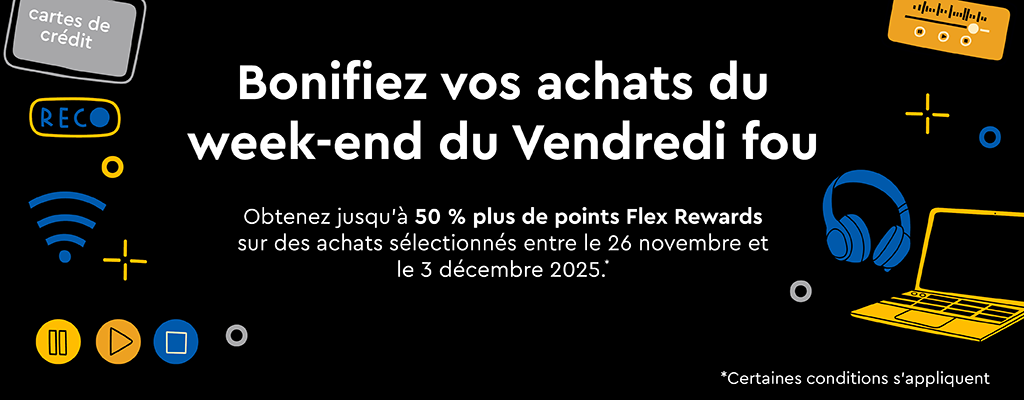 Du 26 novembre au 3 décembre 2025*, vous pouvez obtenir jusqu'à 50 % plus de points Flex Rewards pour chaque dollar dépensé sur du contenu multimédia, des appareils électroniques, du divertissement et plus encore. Et ces points s'ajoutent à ceux que vous amassez déjà chaque jour! *Cliquez ici pour consulter les modalités de l'offre.