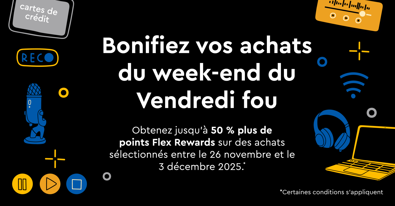 Qui dit Vendredi fou, dit plus de récompenses! Du 26 novembre au 3 décembre 2025, vous pouvez obtenir jusqu’à 50 % plus de points Flex Rewards pour chaque dollar dépensé sur du contenu multimédia, des appareils électroniques, du divertissement et plus encore. Et ces points s’ajoutent à ceux que vous amassez déjà chaque jour!
