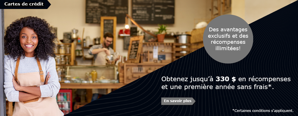 Remarque : Votre caisse populaire vous offrira l’une des options suivants : World EliteMD Mastercard pour entreprise ou Visa Infinite Affaires*. Pour d’autres détails, sélectionnez Toutes les cartes > Cartes d’entreprise dans le haut de l’écran.