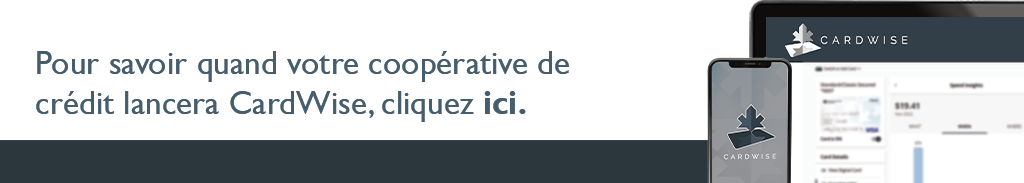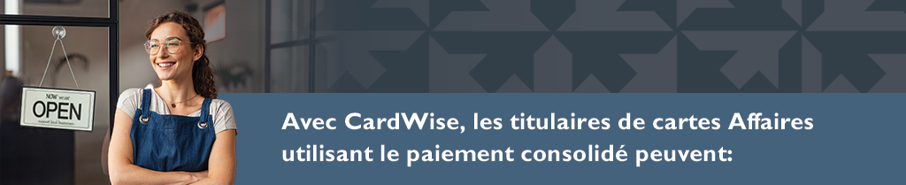 CardWise est un outil de gestion numérique de carte simple et sécuritaire conçu pour répondre à vos besoins quotidiens en lien avec votre compte de crédit d’affaires. Il est disponible en version mobile (application mobile CardWise) et Web (cardwiseonline.ca). Les titulaires de cartes Affaires utilisant la structure de paiement individuel1 peuvent faire une demande pour profiter des caractéristiques et avantages de CardWise, par exemple :